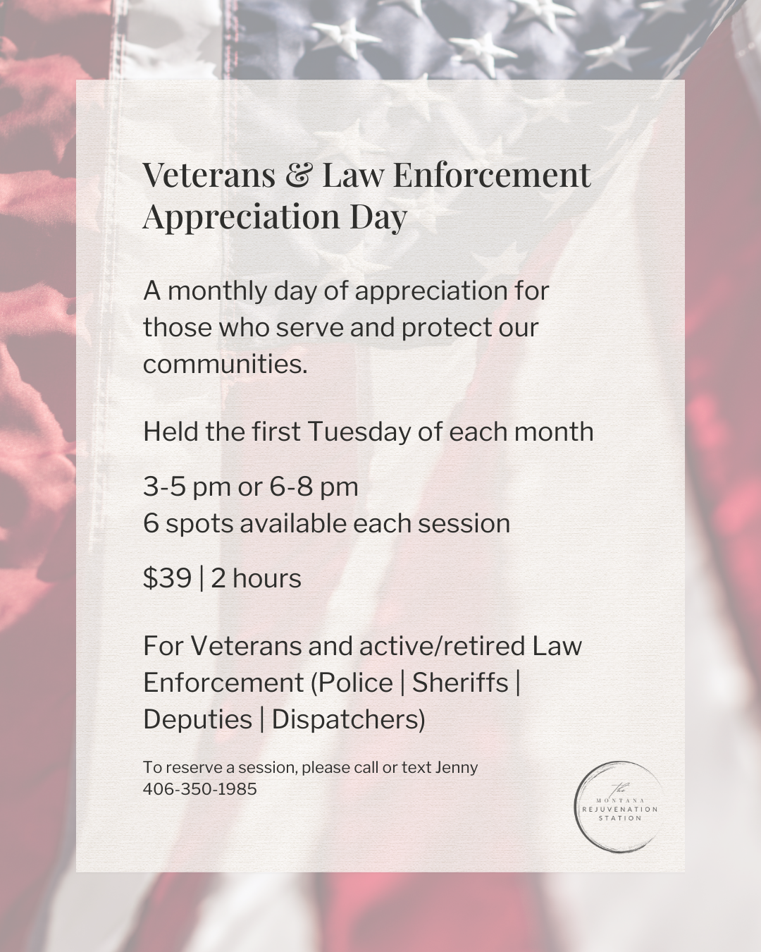 At The Montana Rejuvenation Station, the first Tuesday of each month is dedicated to veterans and those serving in law enforcement as a small gesture of appreciation.